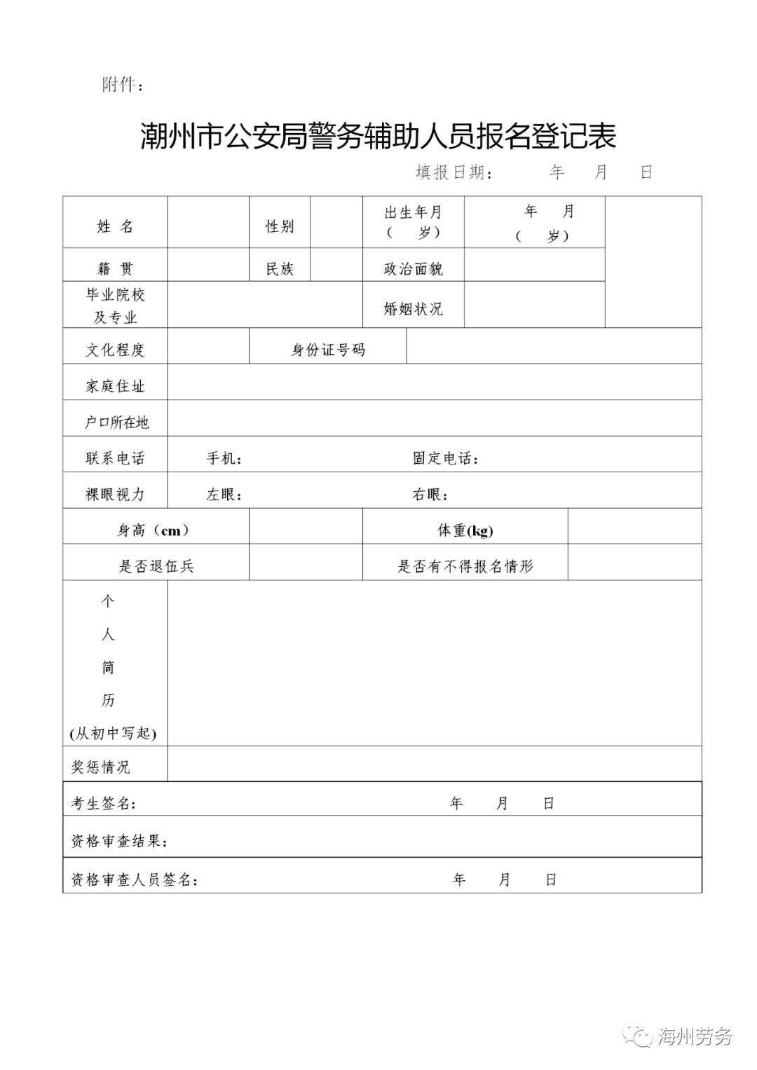 因工作需要,潮州市海州劳务派遣有限公司受潮州市公安局委托,现面向社会公开招聘男性警务辅助人员7名。本次招聘人员主要职责是执行市纪委监委留置看护任务,无留置任务时履行公安机关警务辅助工作。谨就本次招聘公告如下:一、应聘条件应聘人员必须具备下列资格条件:1、自愿从事纪检工作,遵守国家法律法规,拥护中国共产党领导;2、勤劳吃苦,有较强的服从意识、大局观念、团队精神;3、身体健康,能适应24小时倒班制岗位要求的身体条件和工作能力;4、年龄为18至33周岁,男性身高168cm以上(退伍军人、具有留置看护经验的人员身高不限);5、学历高中或中专以上,同等条件下,大专以上学历、中共党员、团员或复退军人及公安院校毕业生、具有留置看护经验的人员优先考虑;6、符合计划生育政策规定;7、现有政府购买服务的编外人员如需报考,须经现聘用单位同意。有下列情形之一的,不得报考:1、受过刑事处罚或者涉嫌违法犯罪尚未查清的;2、曾被行政拘留、收容教育或者有吸毒史的;3、被国家机关、事业单位开除公职或者辞退的;4、曾因违反公安机关管理规定而解除劳动合同的;5、有较为严重的个人不良信用记录的;6、其他不适合从事警务辅助工作的;7、身体有纹身。二、招聘岗位男性警务辅助人员7名三、报名办法与招聘程序1、报名时间:2021年8月2日至9日;联系电话:0768-21310972、报名方式:网络报名